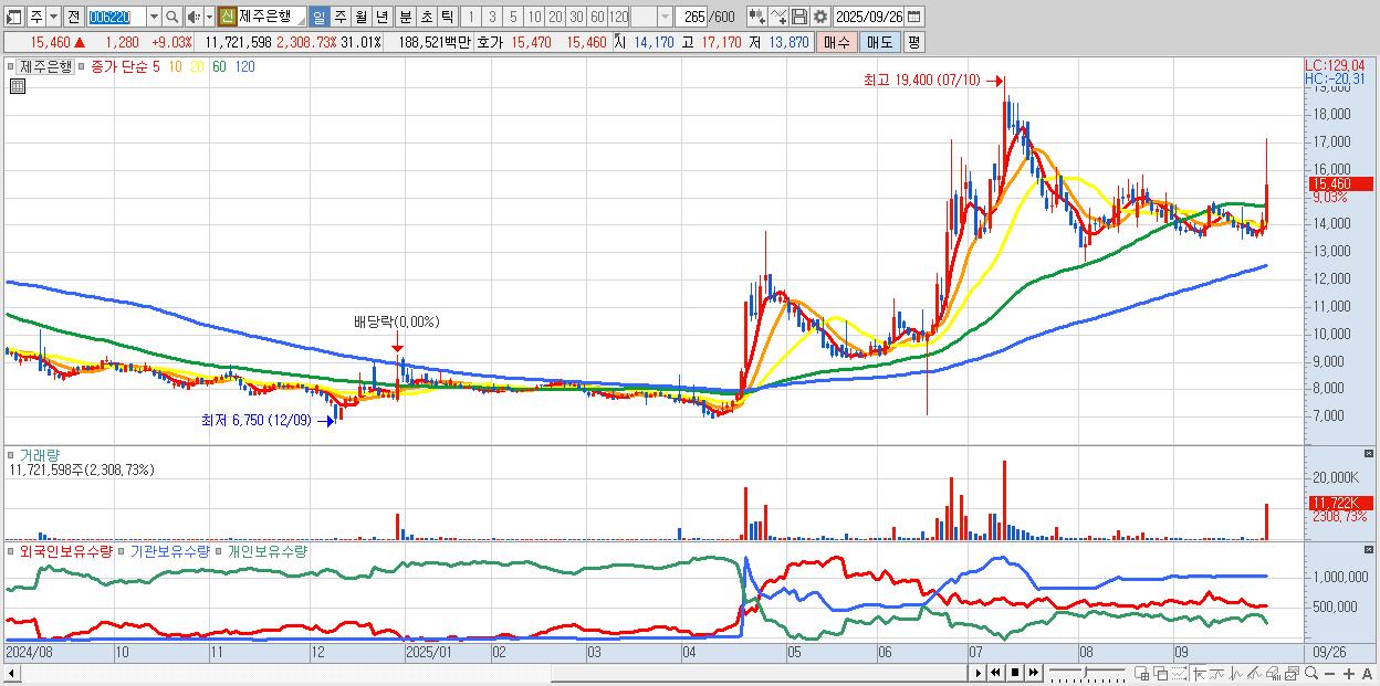 - 제주은행 (15,460원 ▲ 9.03% , 시총: 5,844억, 거래량: 11,721,598, 거래대금:1,885억)