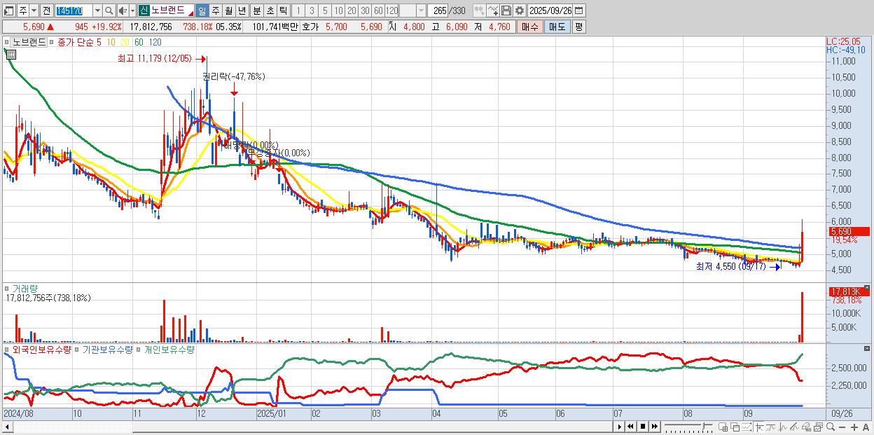- 노브랜드 (5,650원 ▲ 19.07% , 시총: 955억, 거래량: 6,161,231, 거래대금:354억)