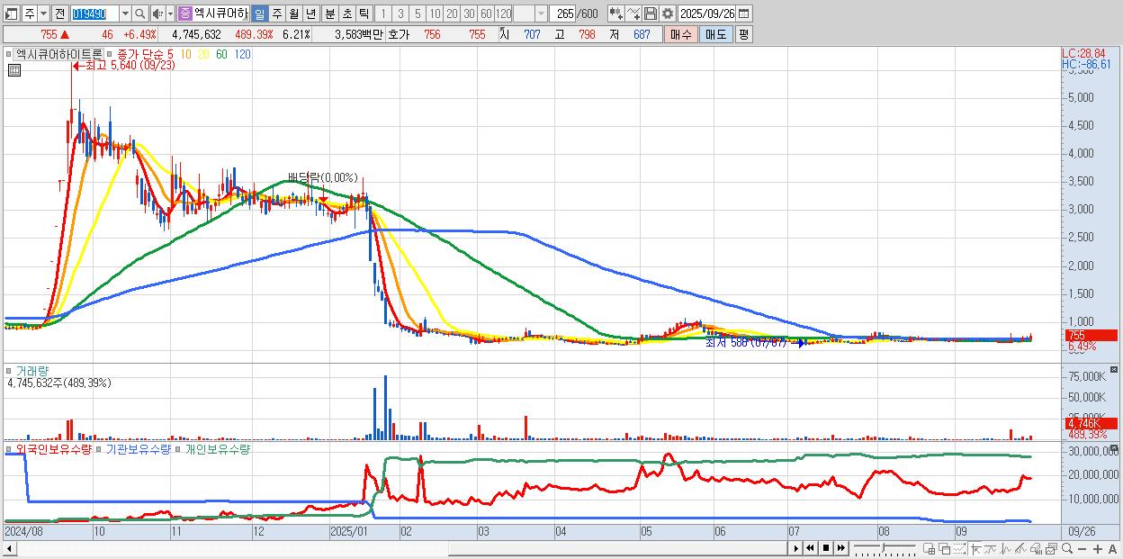 - 엑시큐어하이트론 (755원 ▲ 6.49% , 시총: 577억, 거래량: 4,745,632, 거래대금:36억)