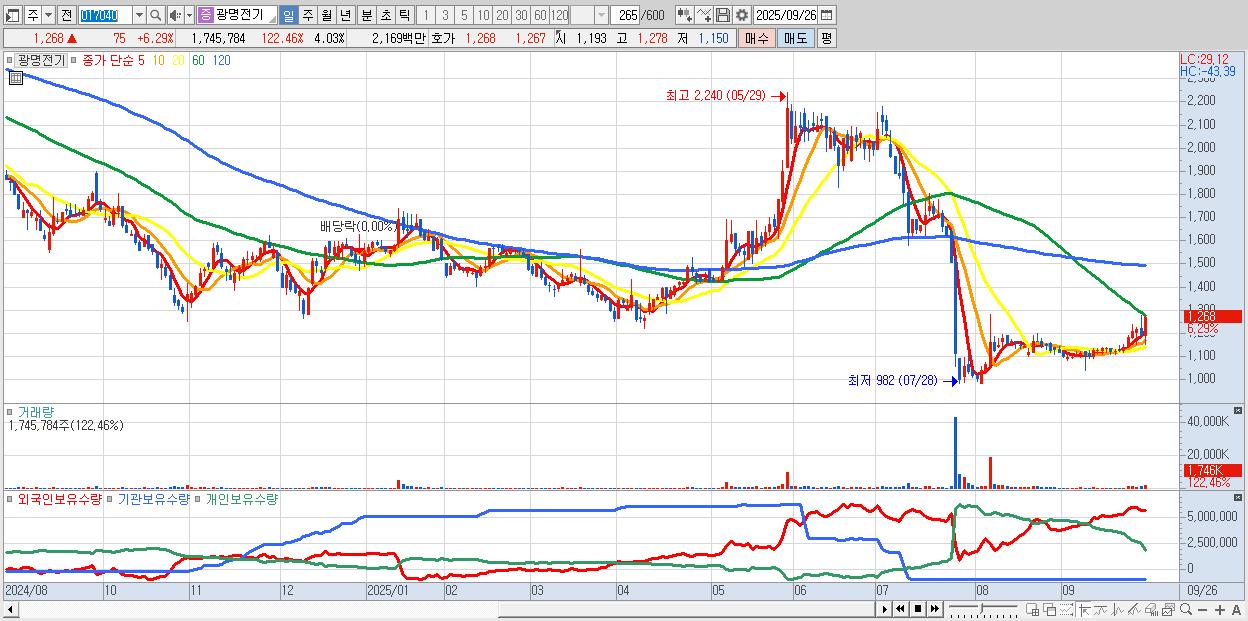 - 광명전기 (1,268원 ▲ 6.29% , 시총: 550억, 거래량: 1,745,784, 거래대금:22억)