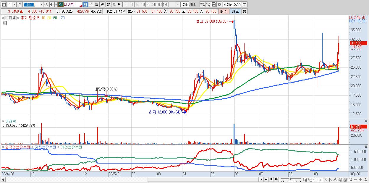 - 나이벡 (31,250원 ▲ 15.1% , 시총: 3,534억, 거래량: 2,150,990, 거래대금:677억)