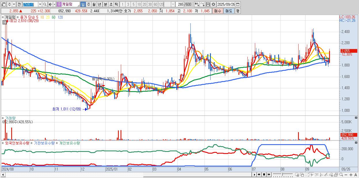 - 케일럼 (2,055원 ▲ 12.3% , 시총: 550억, 거래량: 652,990, 거래대금:13억)