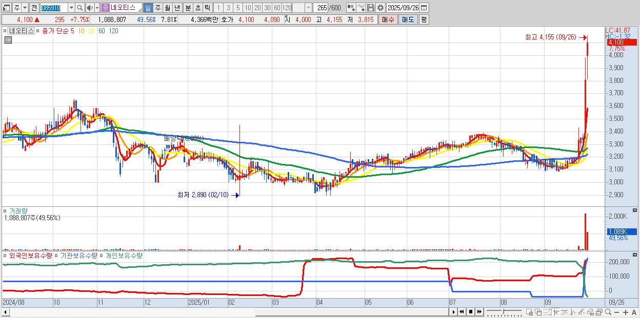 - 네오티스 (4,100원 ▲ 7.75% , 시총: 571억, 거래량: 1,088,807, 거래대금:44억)