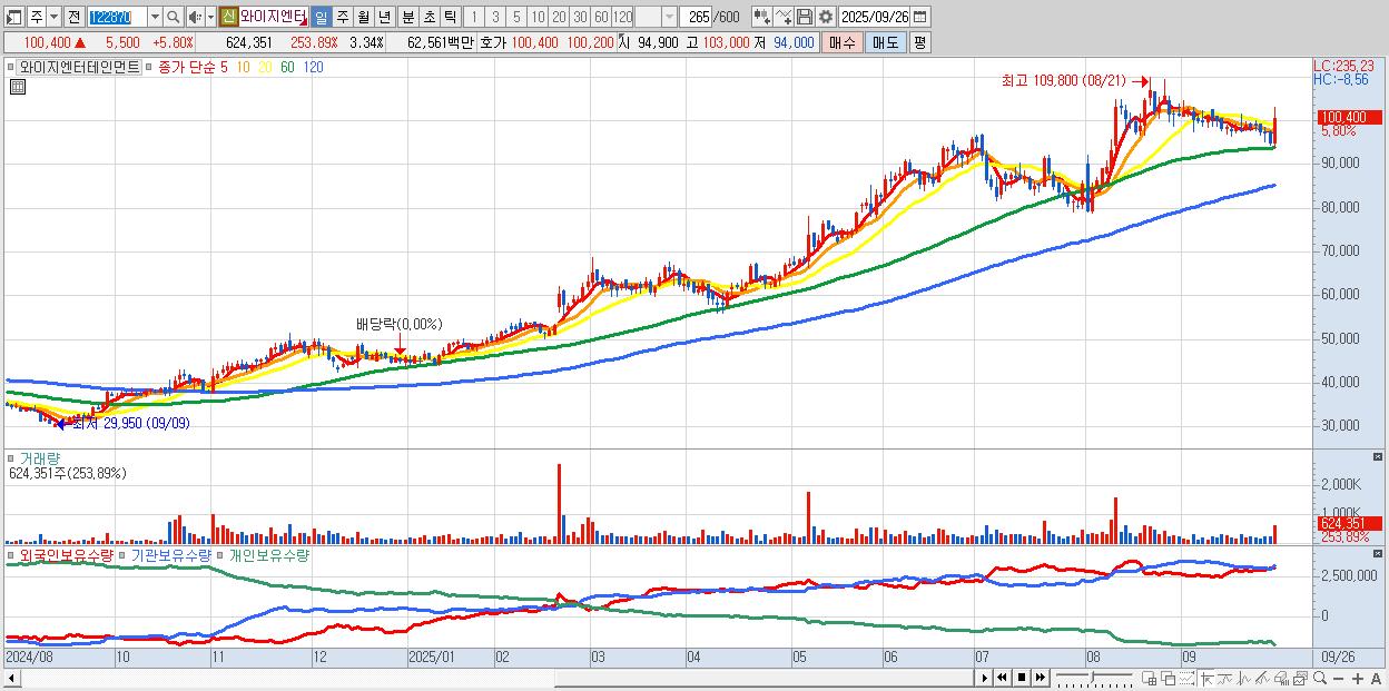 - 와이지엔터테인먼트 (100,700원 ▲ 6.11% , 시총: 18,822억, 거래량: 459,571, 거래대금:461억)