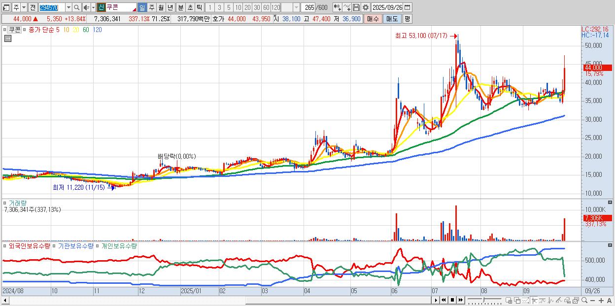 - 쿠콘 (44,800원 ▲ 15.91% , 시총: 4,594억, 거래량: 3,394,443, 거래대금:1,481억)