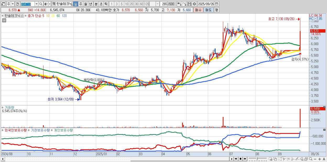 - 한솔테크닉스 (6,570원 ▲ 14.66% , 시총: 2,110억, 거래량: 6,545,074, 거래대금:431억)