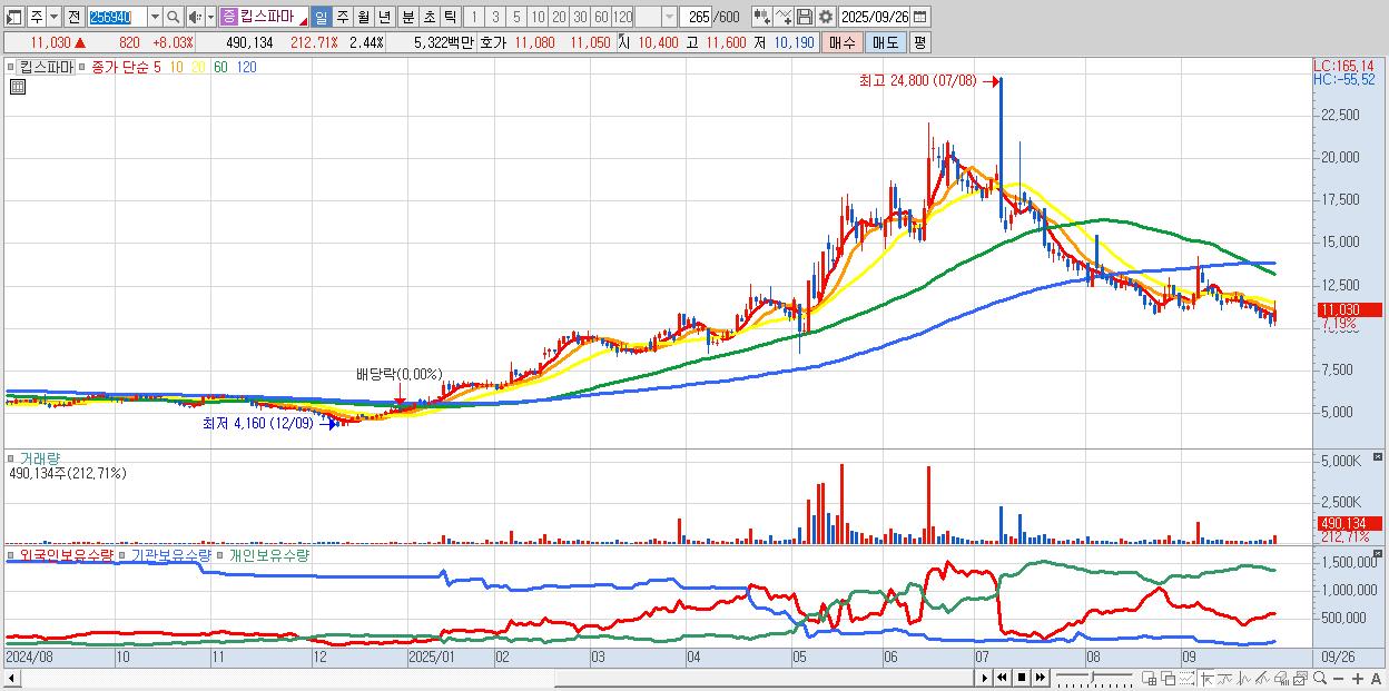 - 킵스파마 (11,040원 ▲ 8.13% , 시총: 2,217억, 거래량: 204,562, 거래대금:22억)