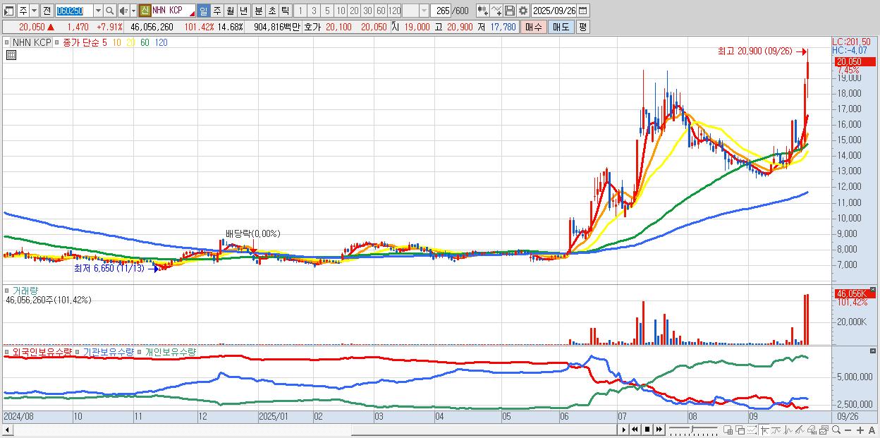 - NHN KCP (20,200원 ▲ 8.72% , 시총: 8,112억, 거래량: 20,068,850, 거래대금:3,955억, KOSDAQ)