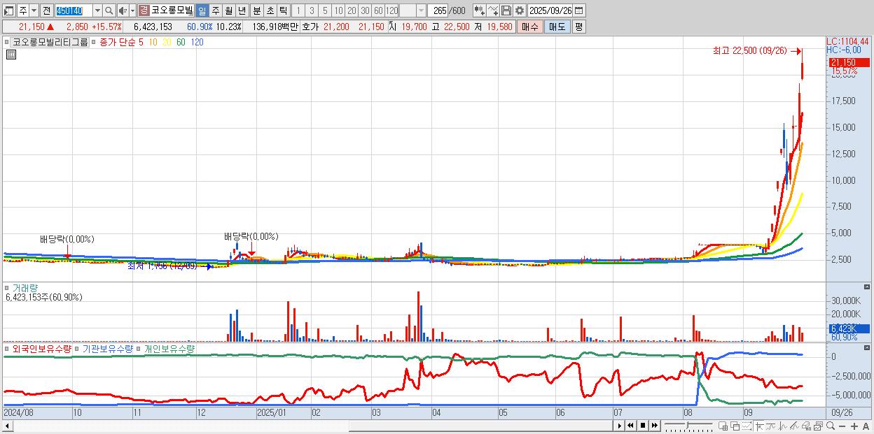 - 코오롱모빌리티그룹 (21,150원 ▲ 15.57% , 시총: 13,277억, 거래량: 6,423,153, 거래대금:1,369억, KOSPI)