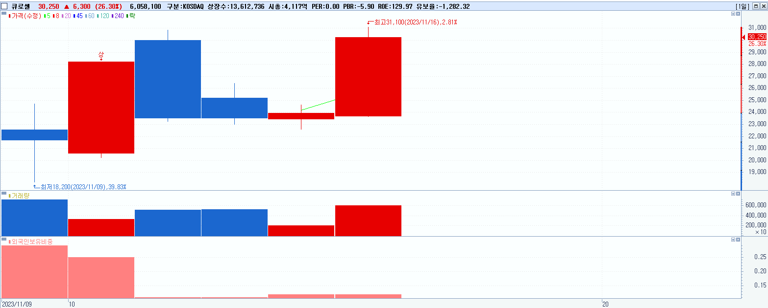 - 큐로셀 (30,250원 ▲ 26.3% , 시총: 4,118억, 거래량: 6,058,100, 거래대금:1,746억)