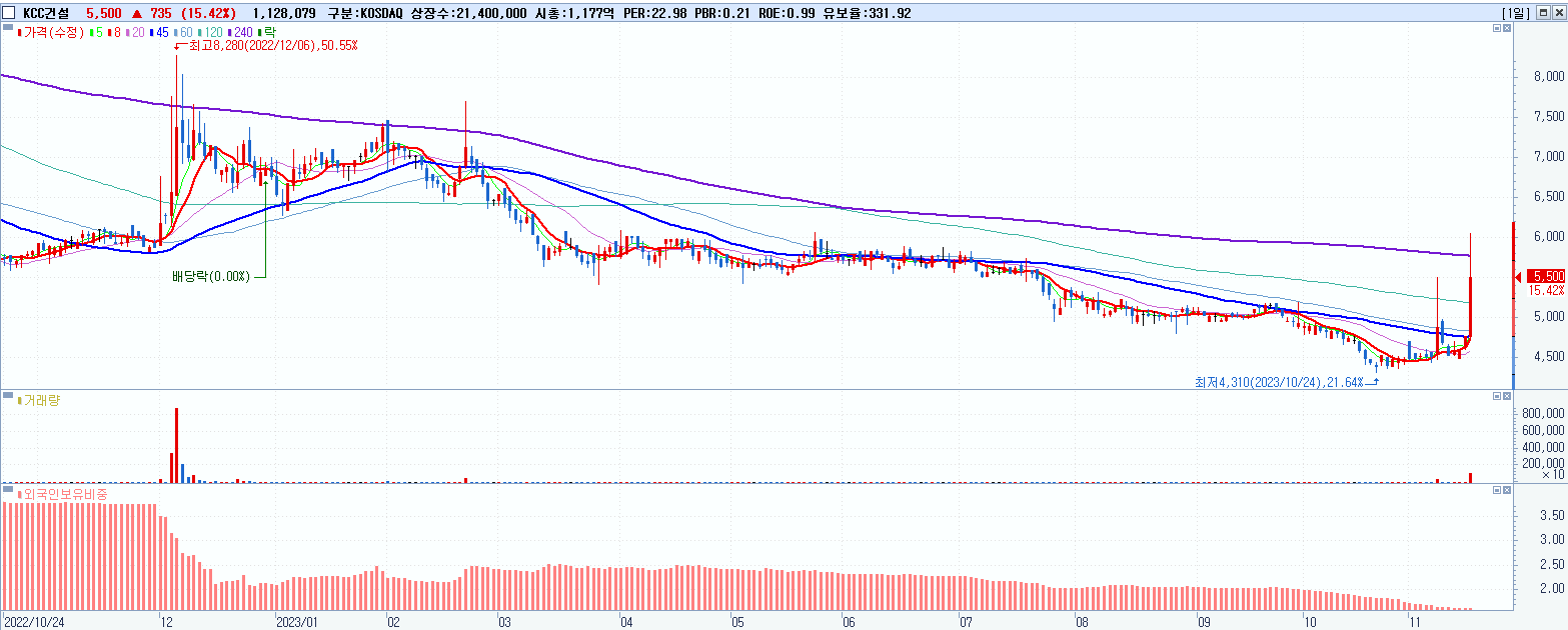 - KCC건설 (5,500원 ▲ 15.42% , 시총: 1,177억, 거래량: 1,128,079, 거래대금:63억)