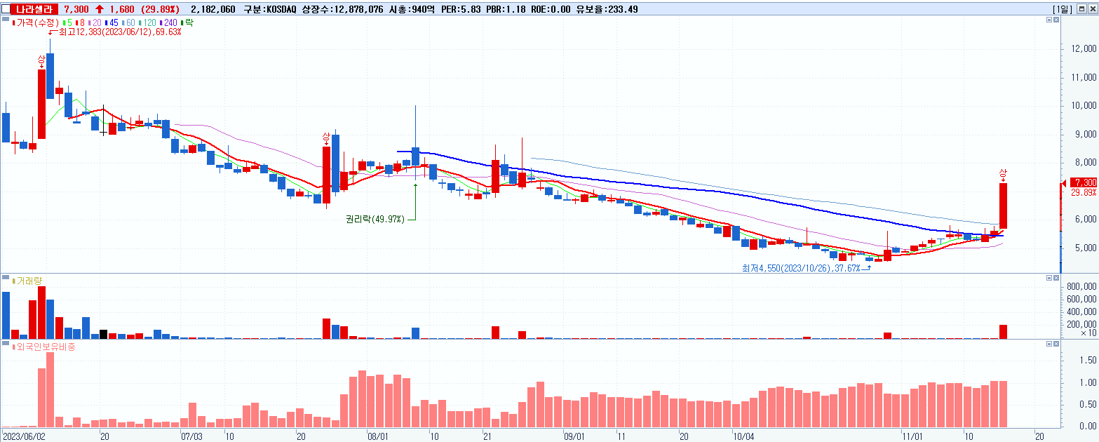 - 나라셀라 (7,300원 ▲ 29.89% , 시총: 940억, 거래량: 2,182,060, 거래대금:150억)