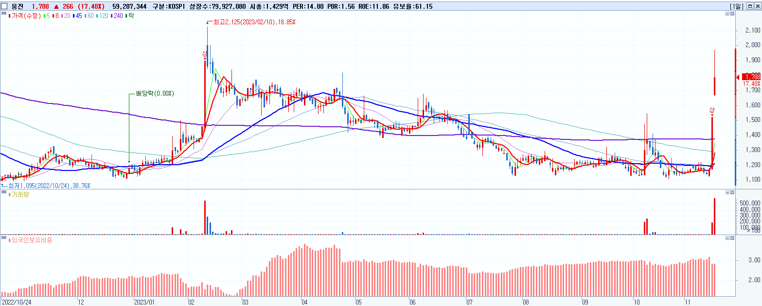 - 웅진 (1,788원 ▲ 17.48% , 시총: 1,429억, 거래량: 59,287,344, 거래대금:1,094억)