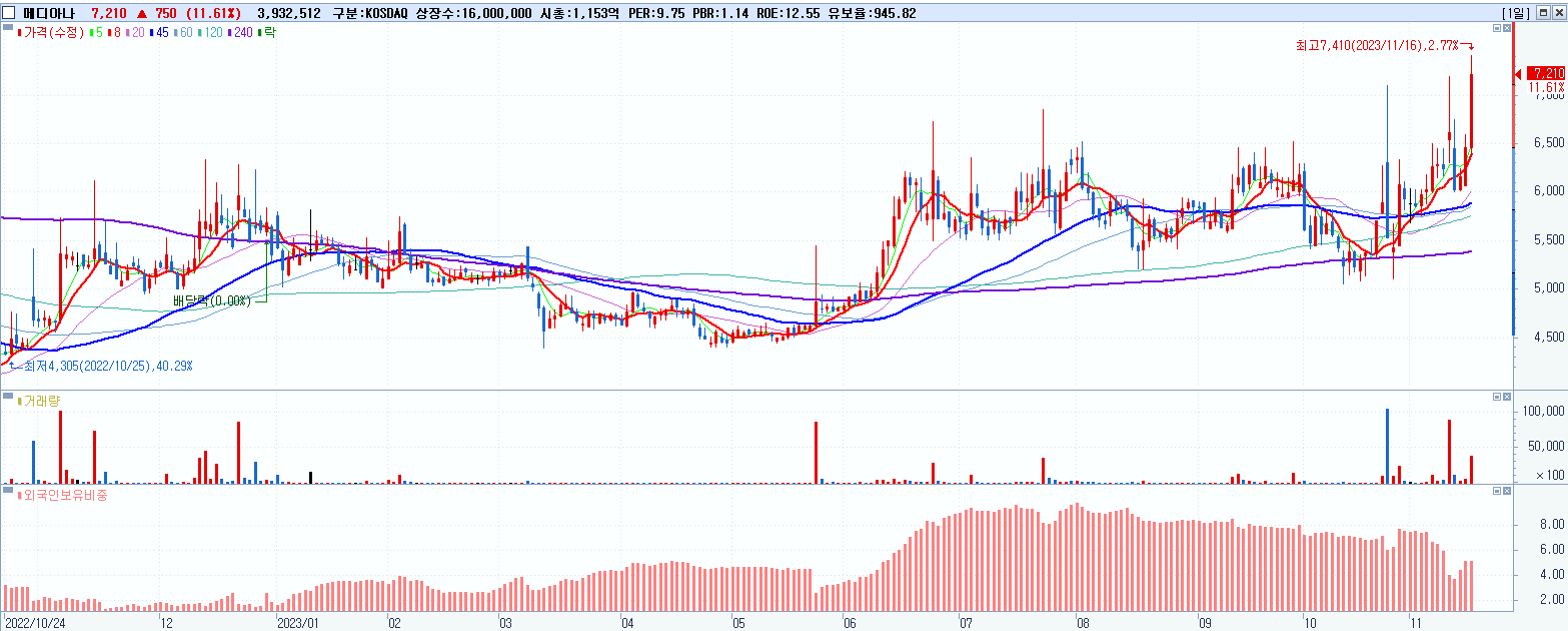 29.메디아나 7,210원 ▲ 11.61% (KOSDAQ, 041920)