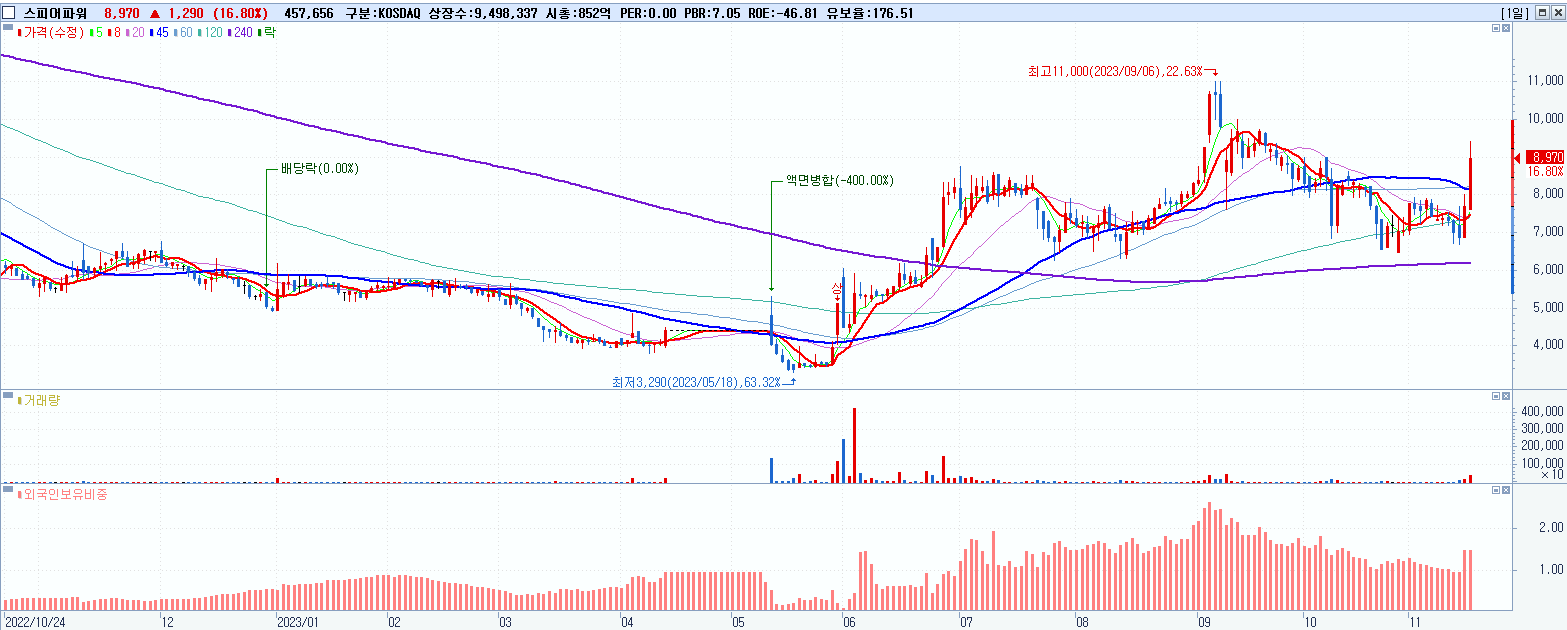 - 스피어파워 (8,970원 ▲ 16.8% , 시총: 852억, 거래량: 457,656, 거래대금:40억)