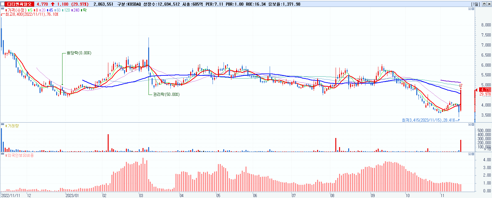 - 디티앤씨알오 (4,770원 ▲ 29.97% , 시총: 606억, 거래량: 2,863,551, 거래대금:129억)