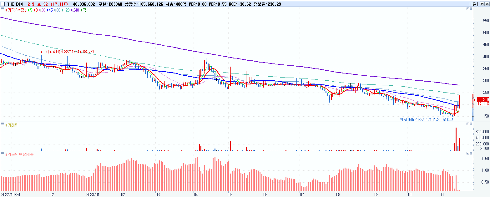 - THE E&M (219원 ▲ 17.11% , 시총: 407억, 거래량: 40,936,032, 거래대금:91억)