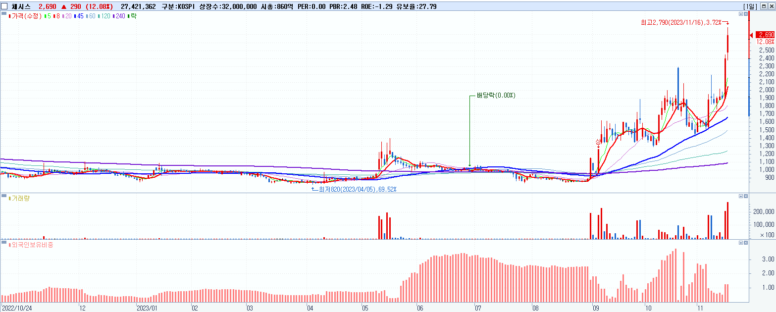 - 체시스 (2,690원 ▲ 12.08% , 시총: 861억, 거래량: 27,421,362, 거래대금:713억)