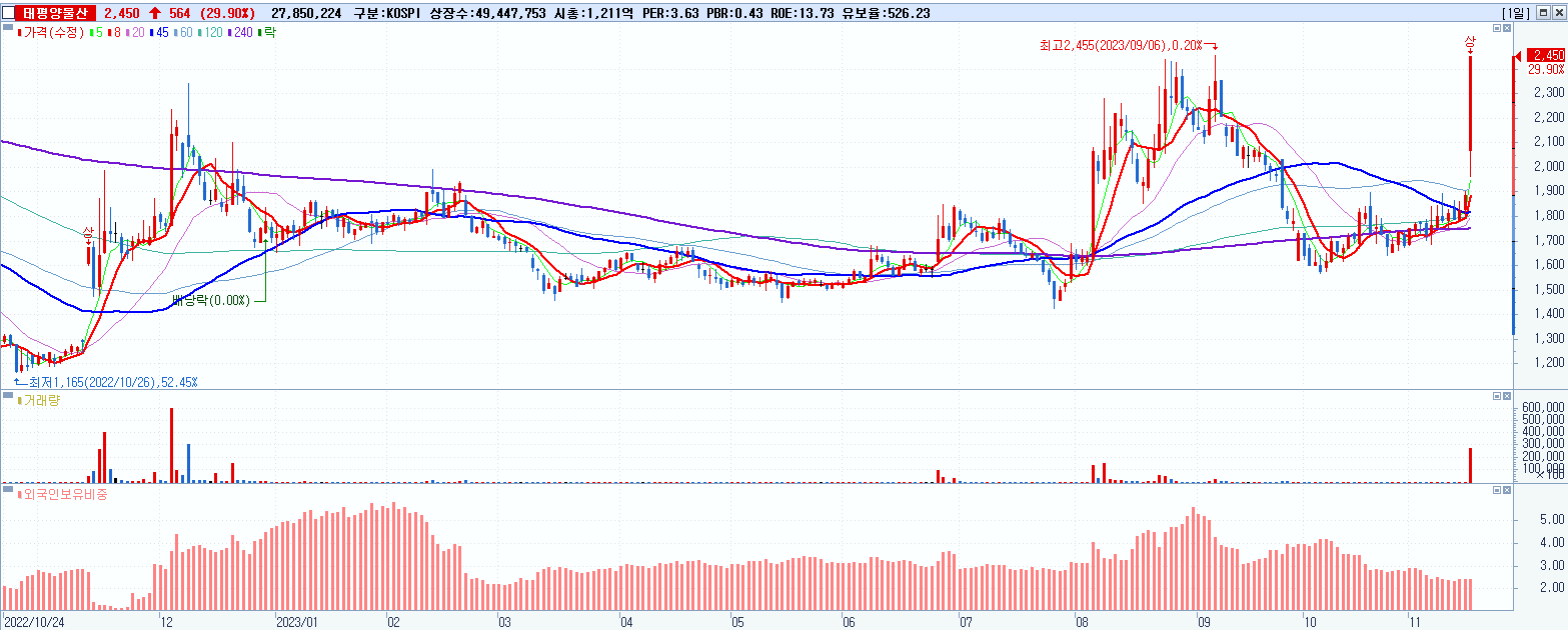 - 태평양물산 (2,450원 ▲ 29.9% , 시총: 1,211억, 거래량: 27,850,224, 거래대금:629억)