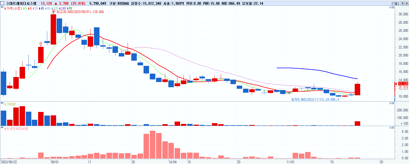 - 스마트레이더시스템 (13,120원 ▲ 25.91% , 시총: 1,970억, 거래량: 5,790,049, 거래대금:742억)