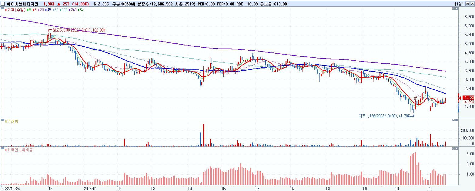 - 에이치앤비디자인 (1,983원 ▲ 14.89% , 시총: 252억, 거래량: 612,395, 거래대금:12억)