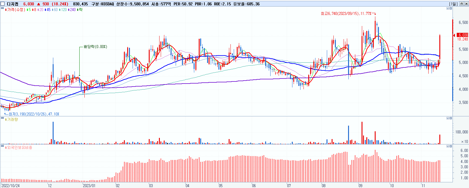- 디지캡 (6,030원 ▲ 18.24% , 시총: 578억, 거래량: 830,435, 거래대금:46억)