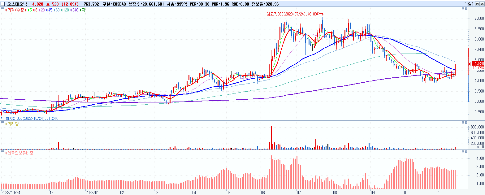 - 오스테오닉 (4,820원 ▲ 12.09% , 시총: 996억, 거래량: 763,782, 거래대금:35억)