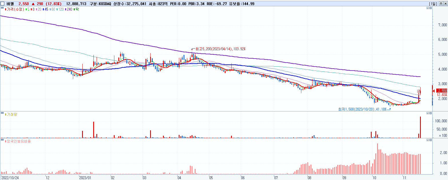 - 비엘 (2,550원 ▲ 12.83% , 시총: 823억, 거래량: 12,888,713, 거래대금:328억)