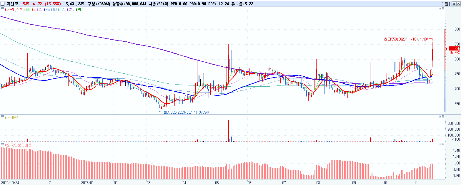 - 지엔코 (535원 ▲ 15.55% , 시총: 524억, 거래량: 5,431,235, 거래대금:29억)