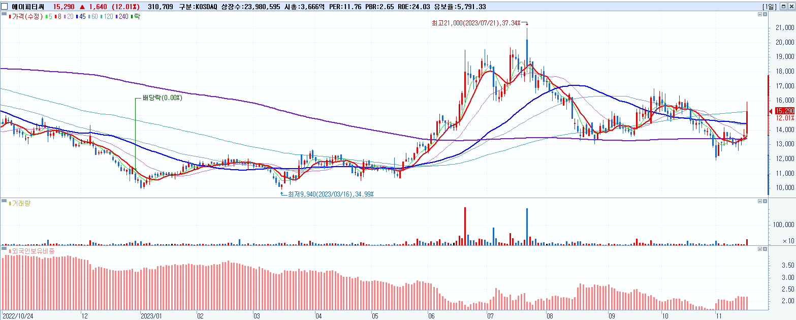 - 에이피티씨 (15,290원 ▲ 12.01% , 시총: 3,667억, 거래량: 310,709, 거래대금:47억)
