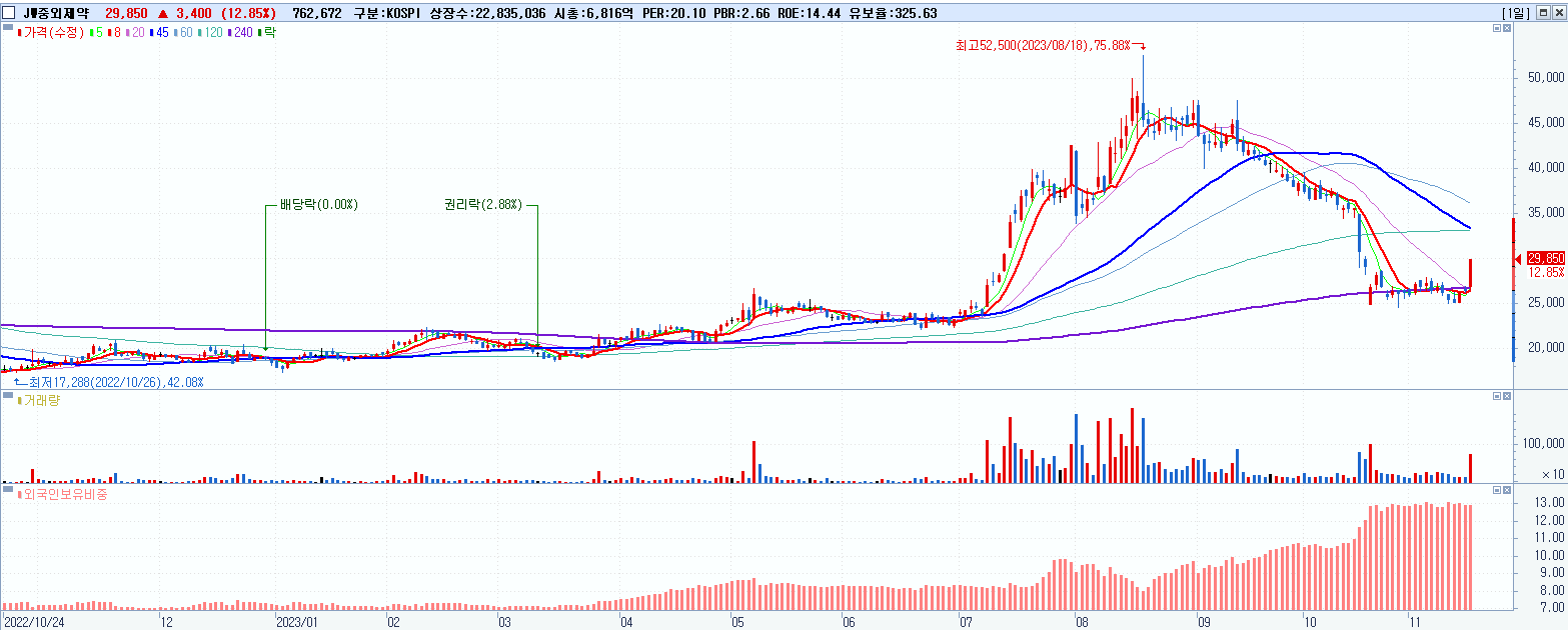 - JW중외제약 (29,850원 ▲ 12.85% , 시총: 6,816억, 거래량: 762,672, 거래대금:218억)