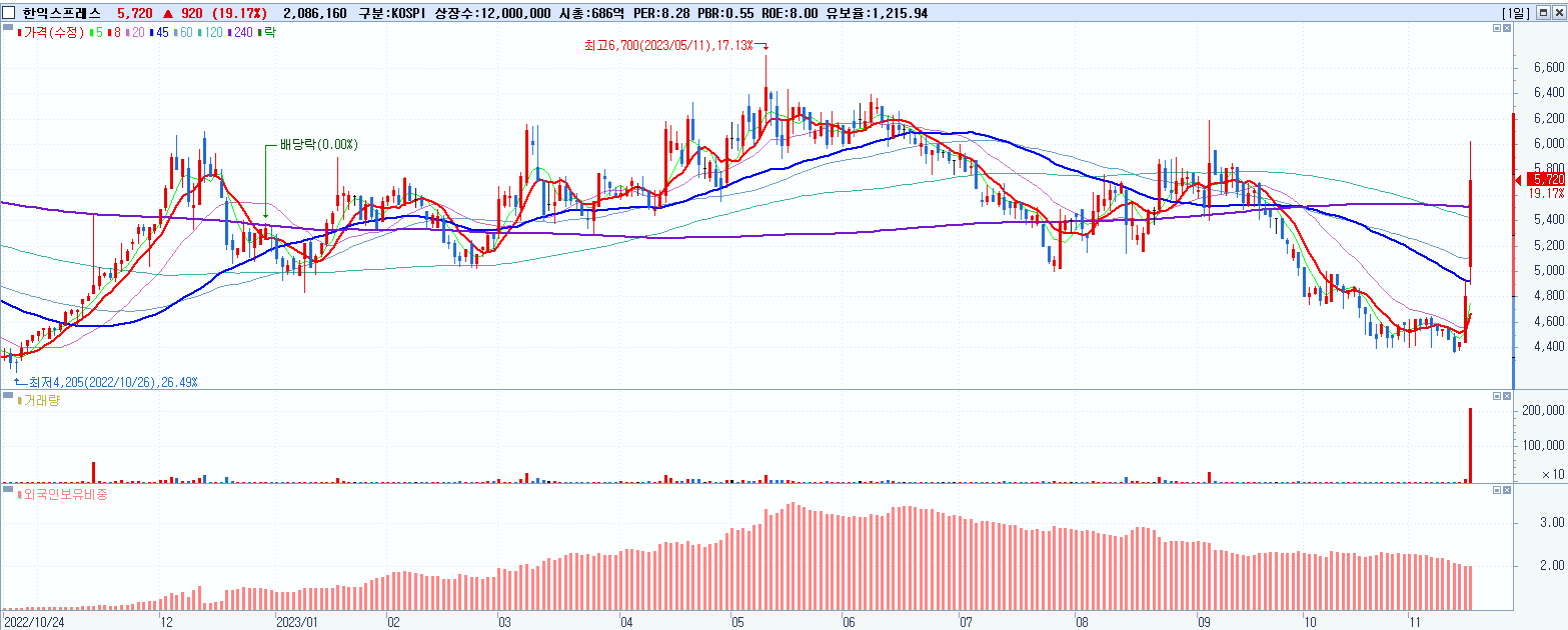 - 한익스프레스 (5,720원 ▲ 19.17% , 시총: 686억, 거래량: 2,086,160, 거래대금:117억)