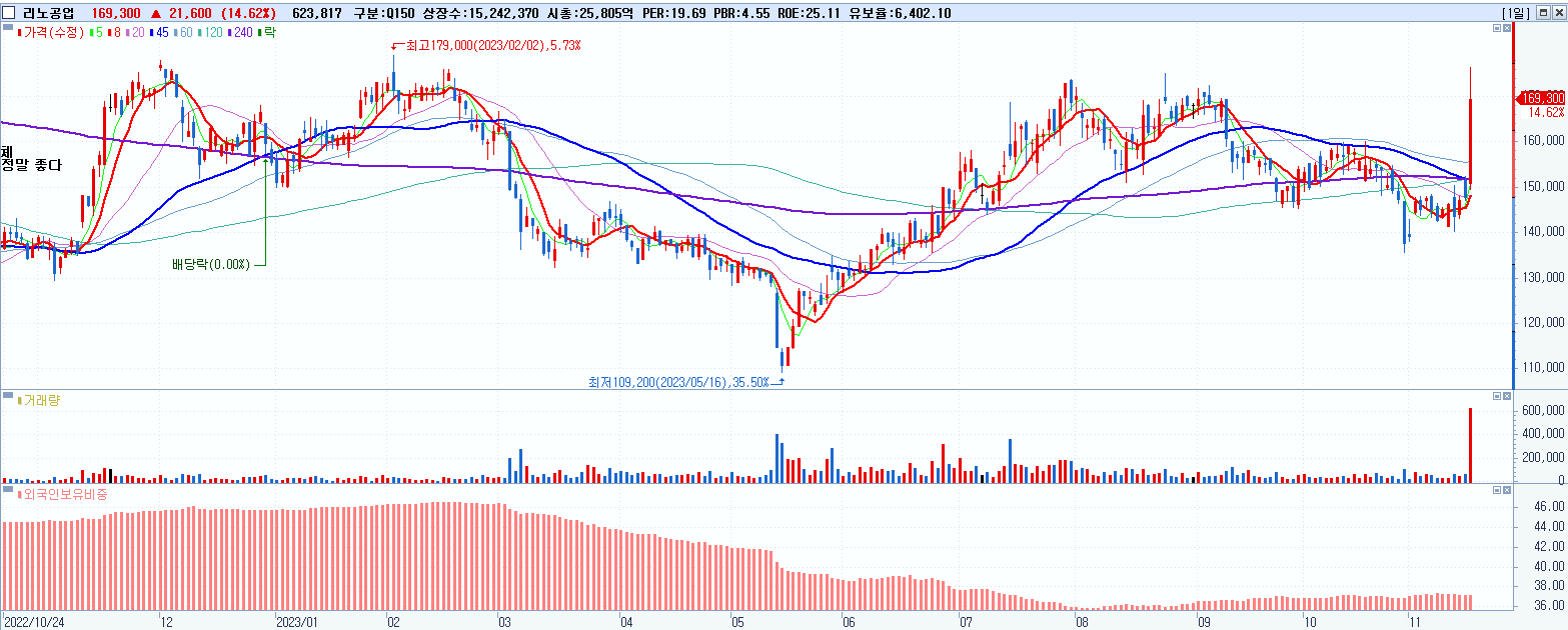 - 리노공업 (169,300원 ▲ 14.62% , 시총: 25,805억, 거래량: 623,817, 거래대금:1,040억)