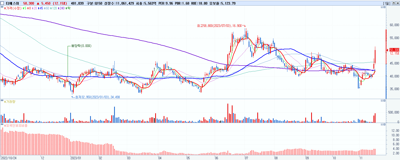 - 티에스이 (50,300원 ▲ 12.15% , 시총: 5,564억, 거래량: 481,039, 거래대금:234억)