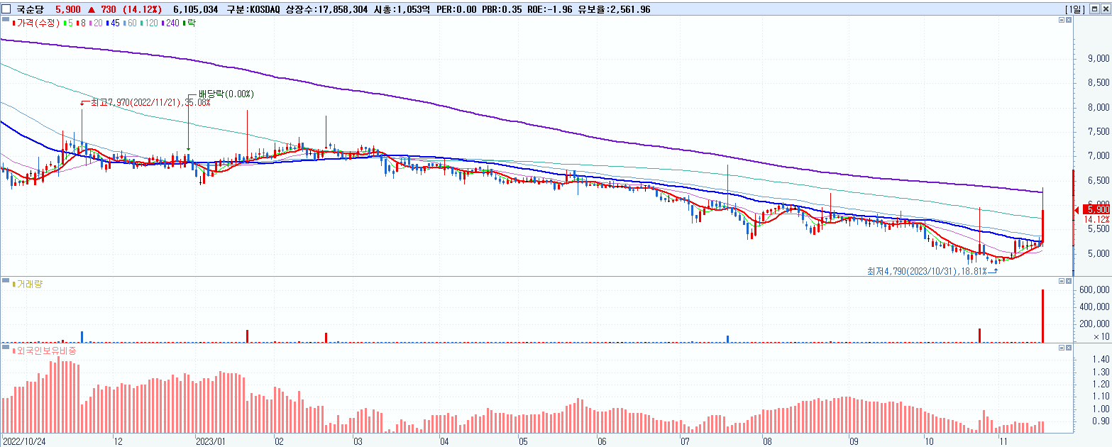 - 국순당 (5,900원 ▲ 14.12% , 시총: 1,054억, 거래량: 6,105,034, 거래대금:364억)