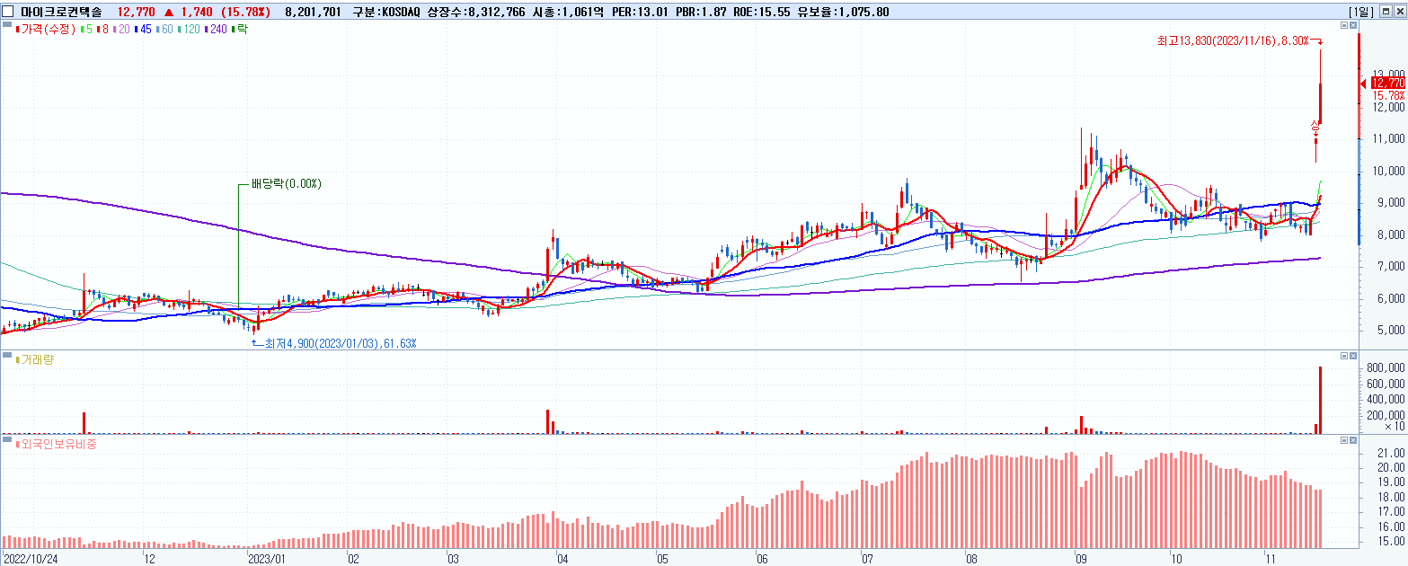 - 마이크로컨텍솔 (12,770원 ▲ 15.78% , 시총: 1,062억, 거래량: 8,201,701, 거래대금:1,071억)