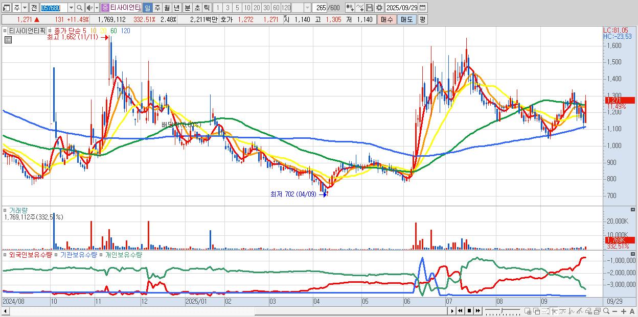 - 티사이언티픽 (1,271원 ▲ 11.49% , 시총: 906억, 거래량: 1,769,112, 거래대금:22억)
