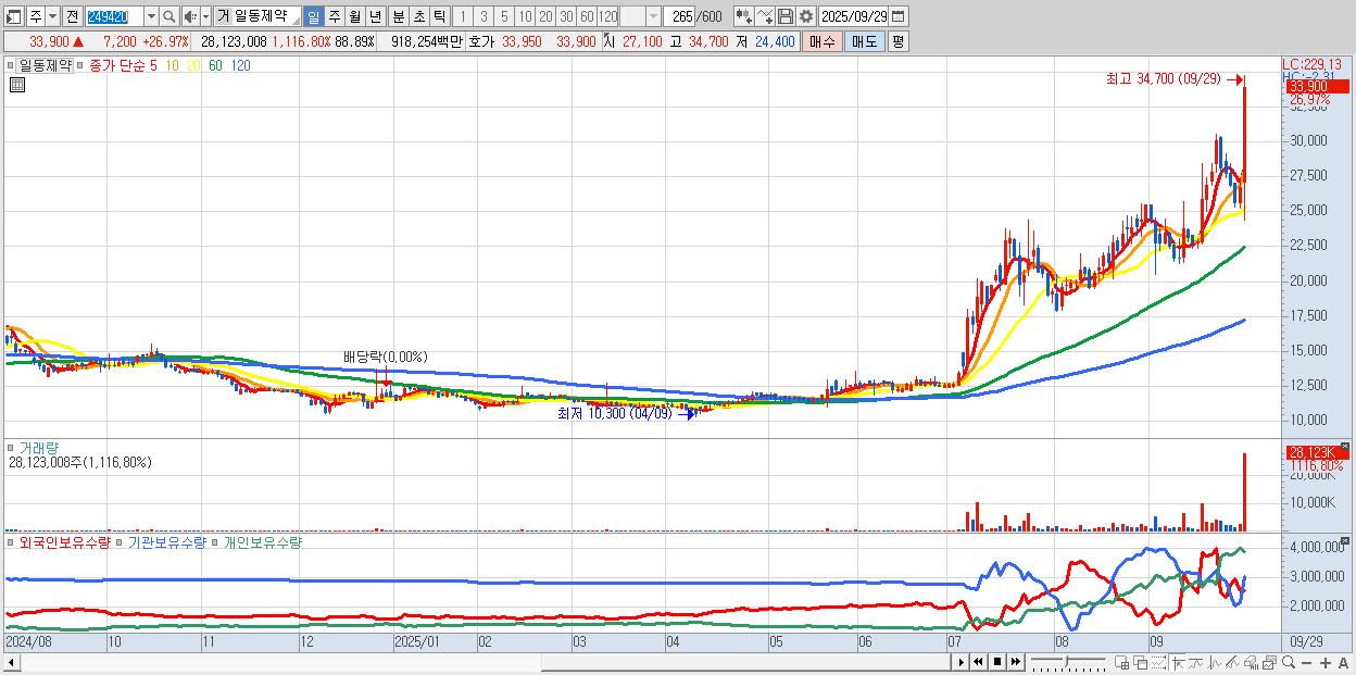 - 일동제약 (33,900원 ▲ 26.97% , 시총: 10,725억, 거래량: 28,123,008, 거래대금:9,183억)