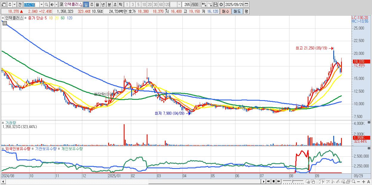 - 인텍플러스 (18,370원 ▲ 12.49% , 시총: 2,363억, 거래량: 1,358,323, 거래대금:247억)