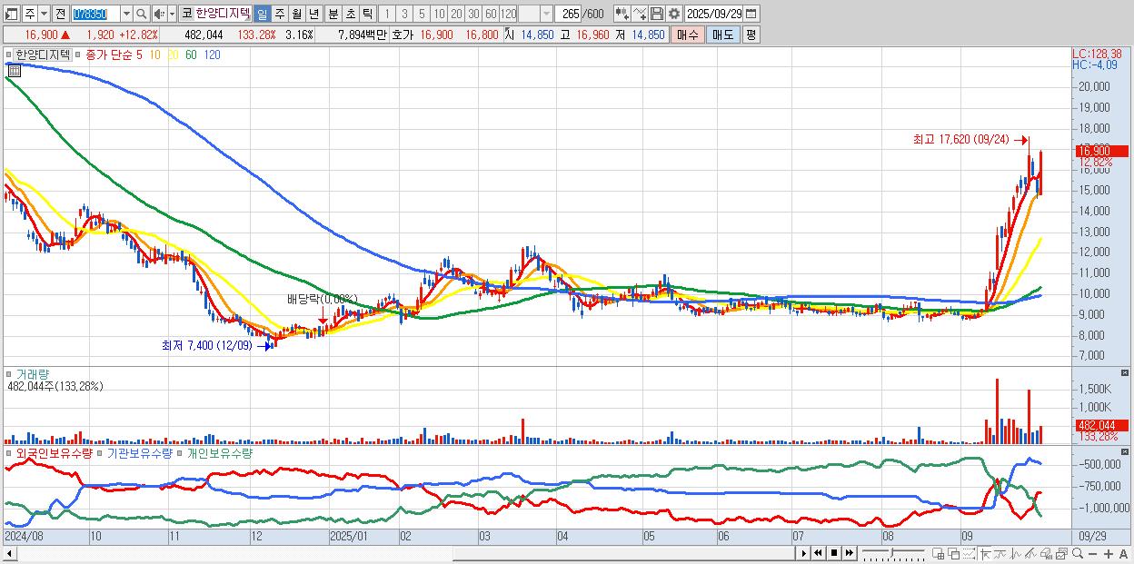 - 한양디지텍 (16,900원 ▲ 12.82% , 시총: 2,576억, 거래량: 482,044, 거래대금:79억)