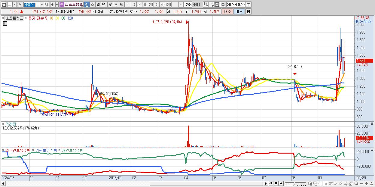 - 소프트캠프 (1,531원 ▲ 12.49% , 시총: 383억, 거래량: 12,832,567, 거래대금:211억)