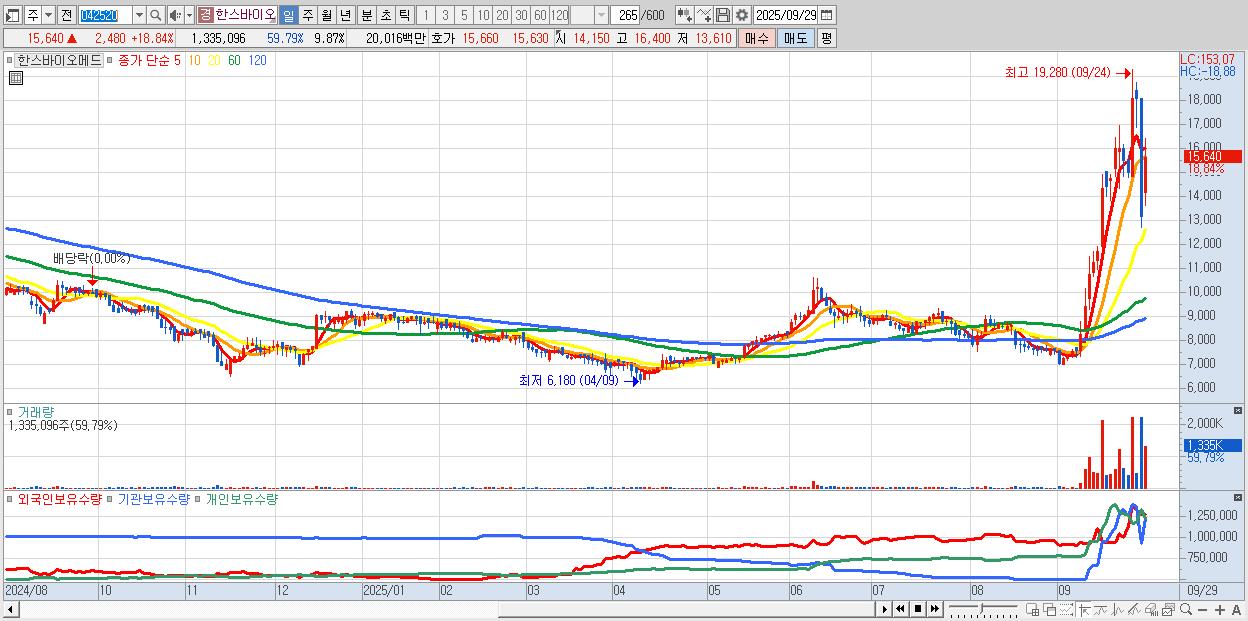 - 한스바이오메드 (15,640원 ▲ 18.84% , 시총: 2,116억, 거래량: 1,335,096, 거래대금:200억)