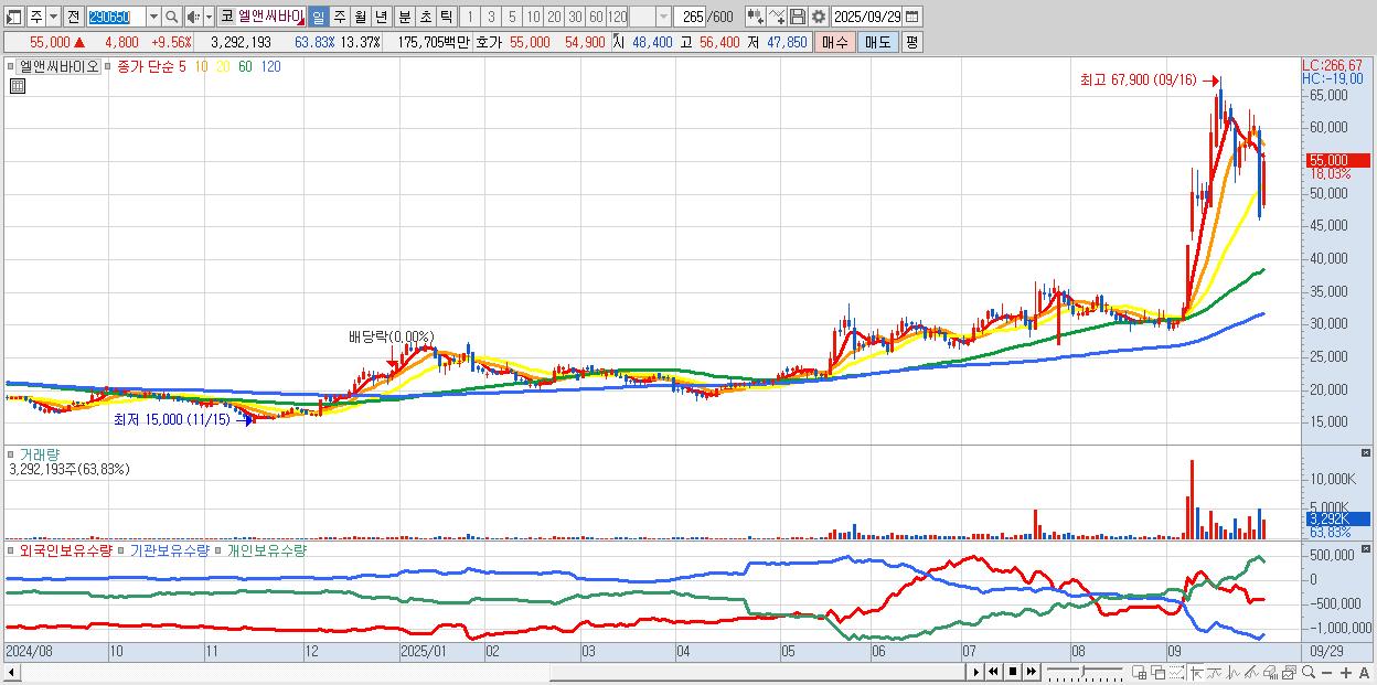 - 엘앤씨바이오 (55,500원 ▲ 10.56% , 시총: 13,663억, 거래량: 1,259,655, 거래대금:684억)