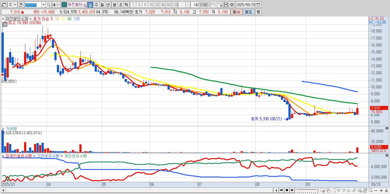 - 대진첨단소재 (7,010원 ▲ 15.68% , 시총: 1,037억, 거래량: 9,524,578, 거래대금:681억)
