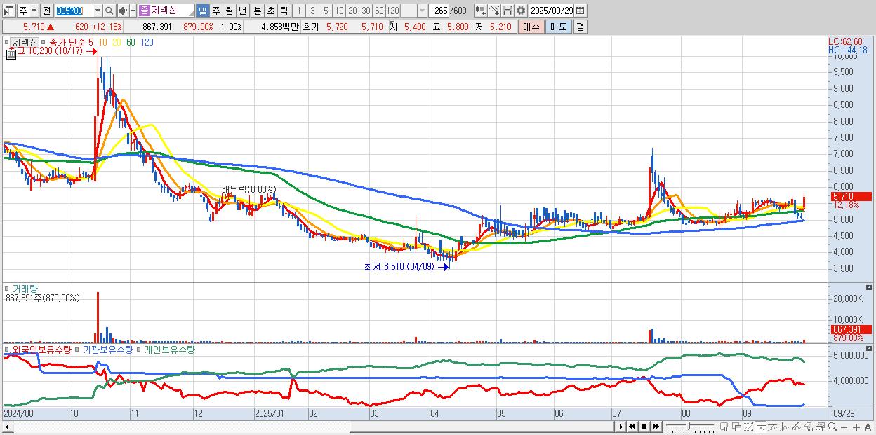 - 제넥신 (5,710원 ▲ 12.18% , 시총: 2,600억, 거래량: 867,391, 거래대금:49억)