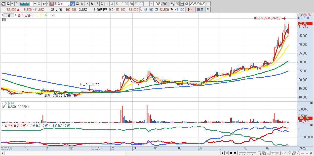 - 티엘비 (52,000원 ▲ 11.83% , 시총: 5,113억, 거래량: 381,146, 거래대금:190억)