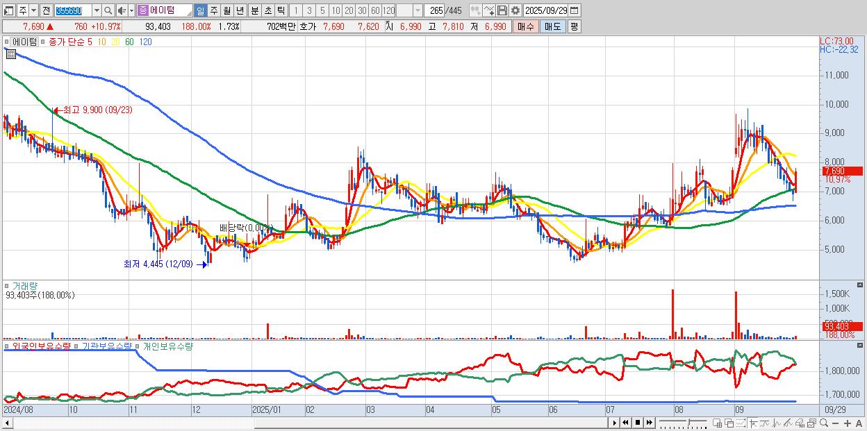 - 에이텀 (7,690원 ▲ 10.97% , 시총: 416억, 거래량: 93,403, 거래대금:7억)