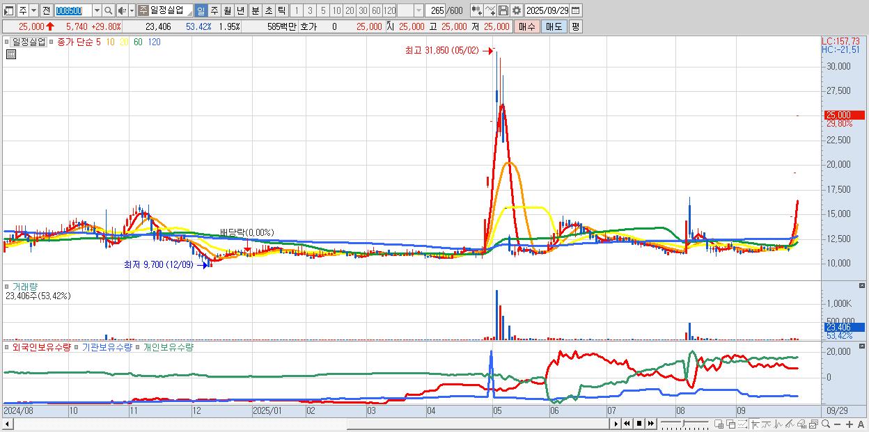 - 일정실업 (25,000원 ▲ 29.8% , 시총: 300억, 거래량: 23,406, 거래대금:6억)