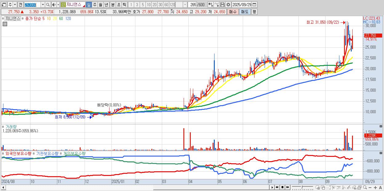 - 지니언스 (26,900원 ▲ 10.25% , 시총: 2,442억, 거래량: 267,421, 거래대금:73억)