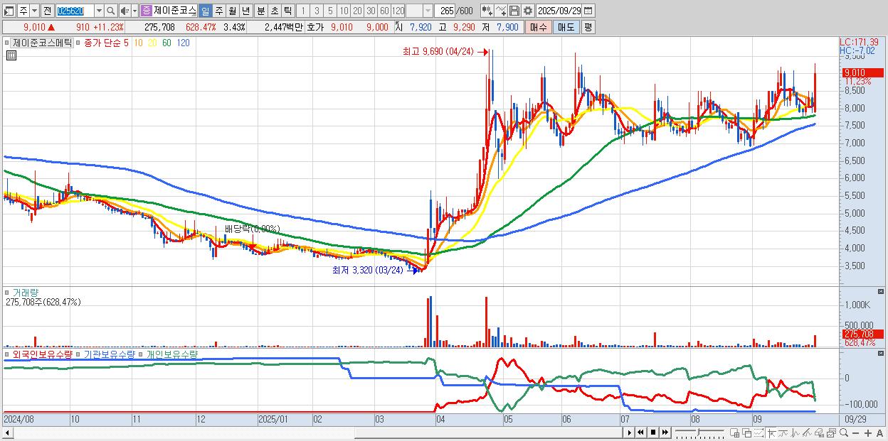 - 제이준코스메틱 (9,010원 ▲ 11.23% , 시총: 724억, 거래량: 275,708, 거래대금:24억)